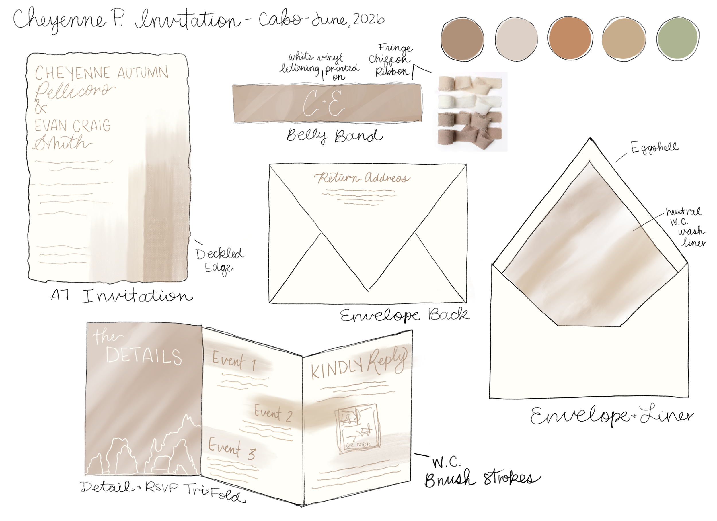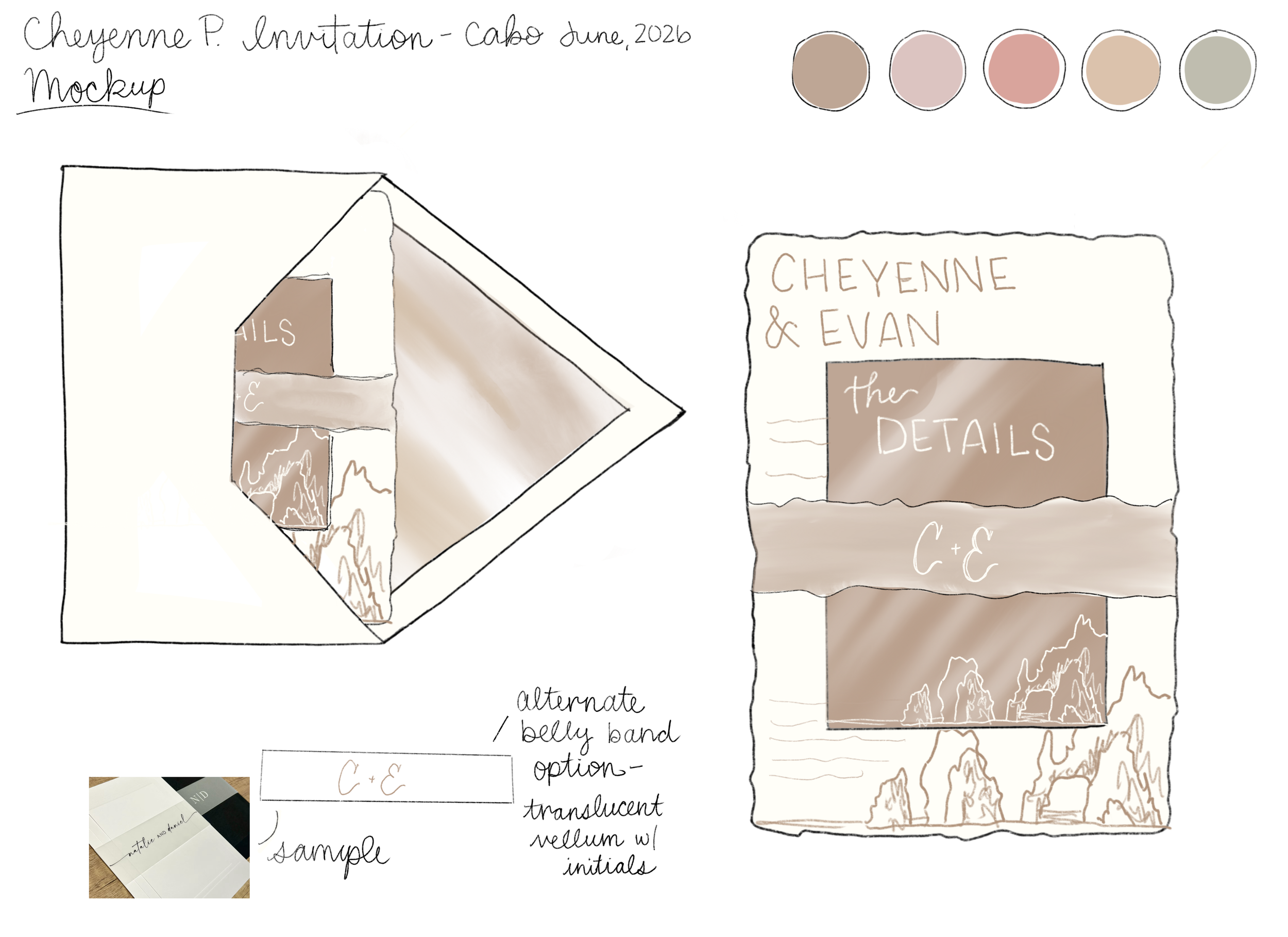 In my client intake form, I ask all potential clients to share a inspiration (mood board, Pinterest board, etc.) so I can get a feel for your vision. During this step, we will schedule a call to really dive into the details. From there, I will send you a sketch of your project with possible color palettes and prints (stationery suite, signage, etc.)